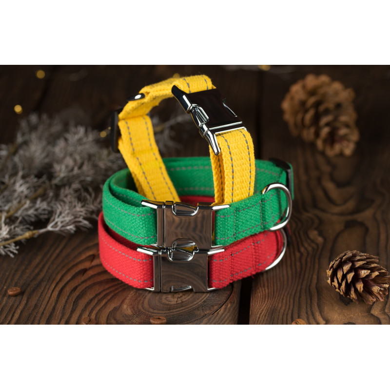 Світловідбиваючий нашийник для собак Bronzedog Cotton дуже міцний, надійний та безпечний. Виготовлений з натурального матеріалу бавовняної сировини найвищої якості, що робить його м'яким і приємним на дотик. Високоміцна бавовняна стрічка не втрачає колір при пранні і не вигоряє на сонці. Він ідеально підходить для повсякденного використання та прогулянок у парку. Світловідбиваючі елементи допомагають убезпечити ваші прогулянки ввечері та вночі. Такі стрічки додають вашому вихованцю помітності для господаря та водіїв у темний час доби. Нашийник укомплектований міцною металевою пряжкою з можливістю нанесення гравіювання. На пряжці можна награвіювати будь-яку інформацію, наприклад: кличка домашньої тварини, контактні дані, адреса, номер мікрочіпа тощо. Текст наноситься за допомогою лазера, тому з часом він не стирається і не тьмяніє.