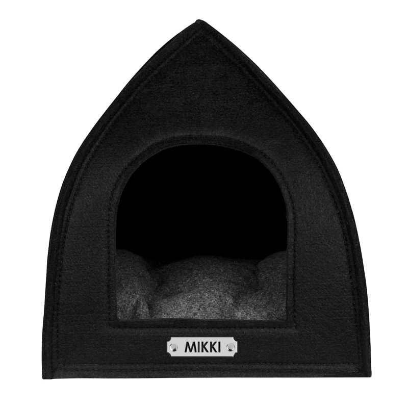 Цей будиночок для домашніх тварин виготовлений з високоякісної повсті. Усередині будиночка знімний килимок. Простий сучасний дизайн будиночка для домашніх тварин чудово виглядатиме в будь-якому інтер'єрі. Підходить для котів та маленьких собак. На будиночку за допомогою заклепок можна закріпити адресник, на якому наші майстри можуть нагрівати будь-яку інформацію за вашим бажанням, наприклад: ім'я домашньої тварини. Текст наноситься за допомогою лазера, тому з часом він не зітреться і не потьмяніє. Доступний у чорному, сірому та бежевому кольорах.