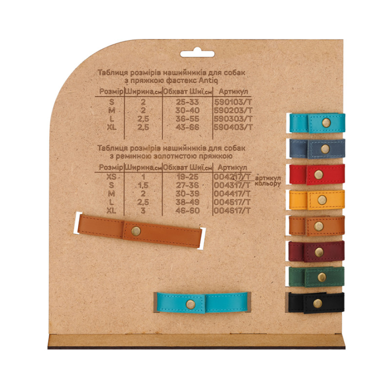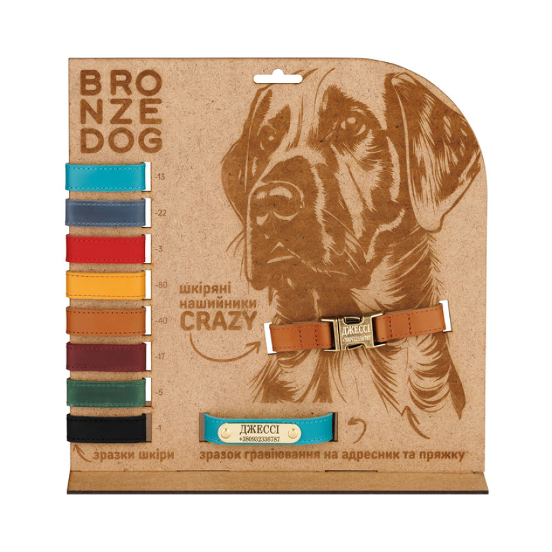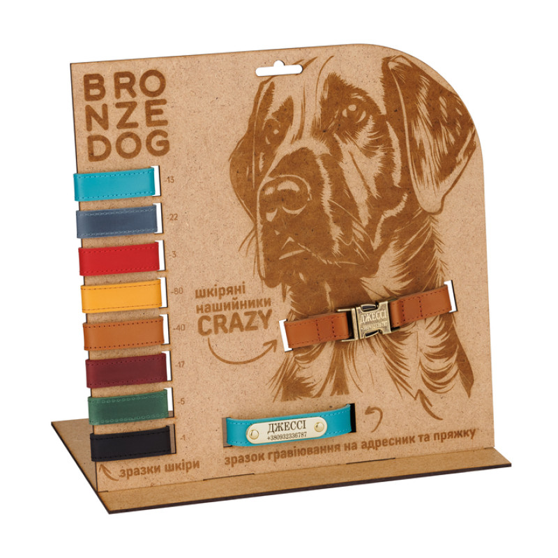 Демонстраційний стенд Crazy – це унікальна пропозиція від BronzeDog. На стенді представлено 8 варіантів кольорів шкіри Crazy які роздрібний купувач має можливість замовити з гравіюванням на пряжці-фастекс Antiq, або на адреснику пластині. При замовленні купувач вказує колір виробу та інформацію для гравіювання (клічка собаки, номер телефону власника собаки тощо). Після чого використавши розмірну таблицю на внутрішній стороні стенду вам зрозуміло артикул виробу, таким чином замовлення готове і передається нам на швидке опрацювання. Стенд компактних розмірів (30/30 см) і дозволяє розмістити його в прикасовій зоні. Стенд можливо розмістити на підставці стоя, або за потреби повісити його використовуючи спеціальний для цього підготовлений підвісний отвір. Ця пропозиція дозволяє запролнувати вашим покупцям товар супер преміум класу з гравіюванням на них ! Ваші покупці можуть замовити всі представлені на стенді кольори виробів з будь-яким текстом гравіювання.